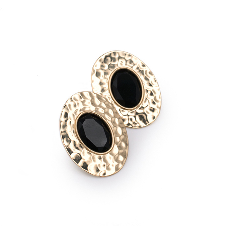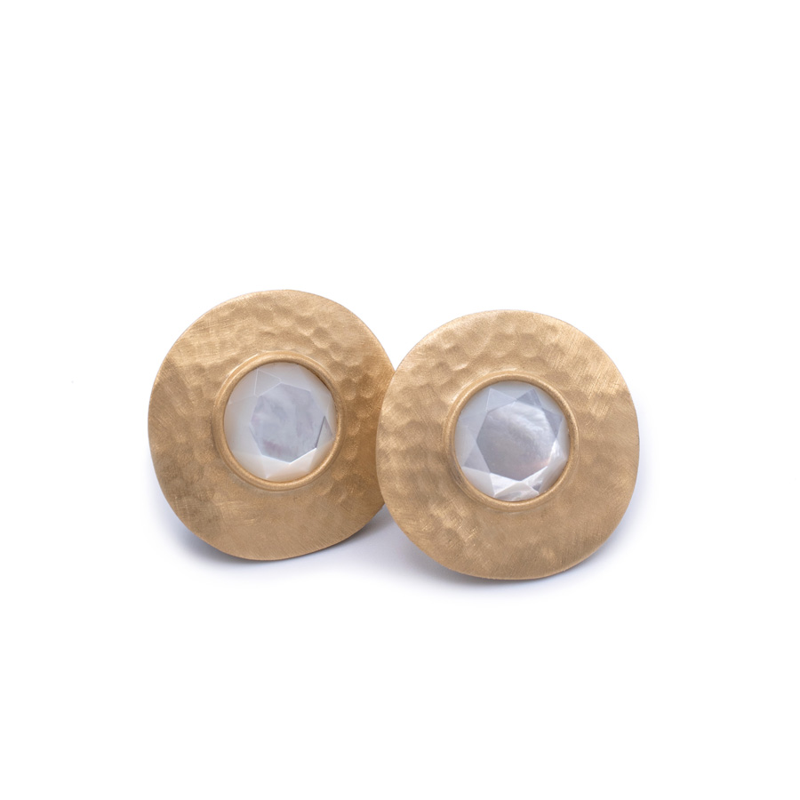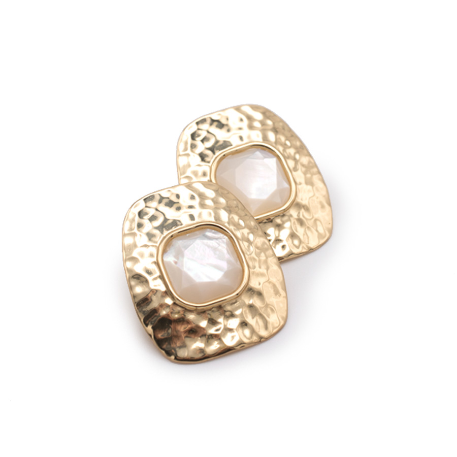 Mirror-polished surfaces, enhanced by a refined hammered effect, highlight the elegant 23-carat gold plating. The addition of mother-of-pearl and black glass pastes gives the collection a bold yet wearable character, making it sophisticated and versatile for any occasion.